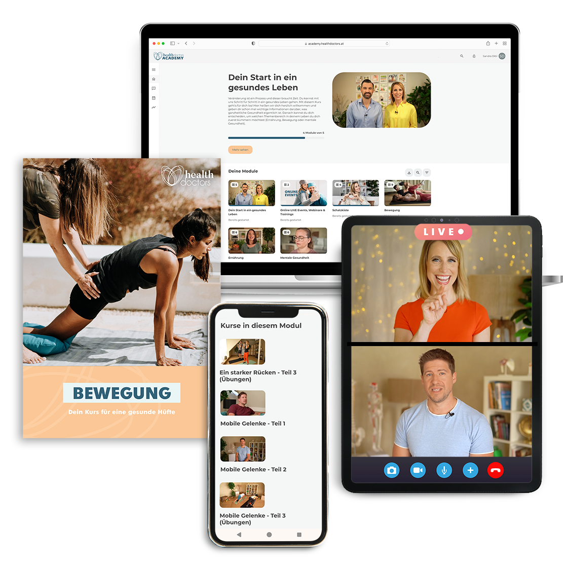 Mit deinem Membership in unserer Healthdoctors Academy, bekommst du neben den Bewegungskursen auch Zugang zu den Kursen aus den Bereichen „Ernährung“ und „Mindset“.